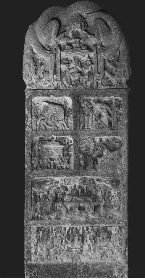 属唐代,山西省临猗县大云寺遗物。碑正面雕涅磐故事六图,上部四图——左面为“纳棺”、“临终遗戒”,右面为“荼毗”、“送葬”。现藏山西省博物馆。