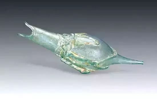 属北燕时期。淡绿色玻璃质,质光亮,半透明,微见银绿色锈浸。背上以玻璃条粘出一对雏鸭式的三角形翅膀。此器造型生动别致,在早期玻璃器中十分罕见。现藏辽宁省博物馆。